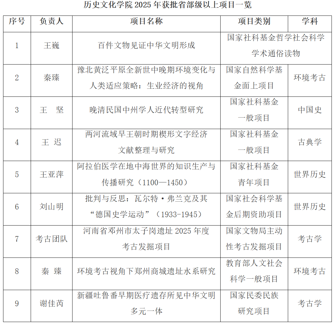 在项目申报中成果丰硕,获批各类国家级课题17项,其中国家社科基金和自然基金项目6项,含首次获批国家社科基金哲学社会科学学术通俗读物项目、首次获批国家自然科学基金项目,以及古典学领域首个国家社科基金一般项目;同时获批国家文物局主动性考古发掘项目1项、教育部人文社会科学一般项目1项、国家民委民族研究项目1项;国家博士后项目7项,包括中国博士后基金特别资助1项、面上资助4项,国家资助博士后研究人员计划B档1项、C档1项;全国考古人才振兴计划项目创新团队子课题1项。此外,获批河南省社科基金项目6项(一般项目1项、青年项目1项、文化研究专项4项),河南省科技考古提升专项2项。2025年累计获批省部级以上项目25项。
