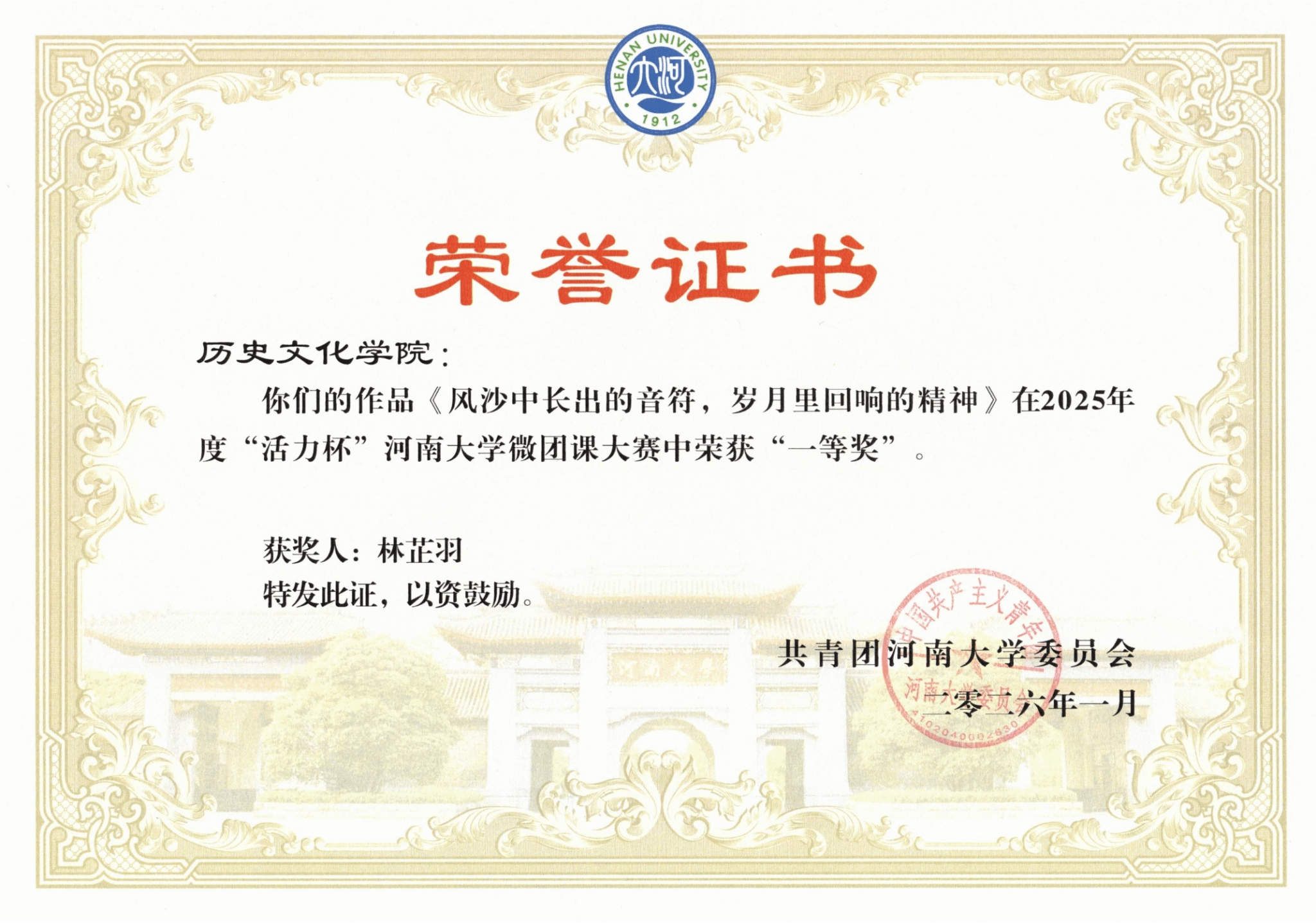 在微团课比赛中,林芷羽的作品《风沙中长出的音符,岁月里回响的精神》以思想深刻、形式新颖的讲述方式,在校级评比中荣获一等奖,并被推荐参加省级评选,最终斩获河南省二等奖。该作品以兰考泡桐木制成的古筝为切入点,深入挖掘其背后所蕴含的焦裕禄精神,将音乐意象与精神传承有机结合,用青年话语讲述红色故事,体现了国产无码